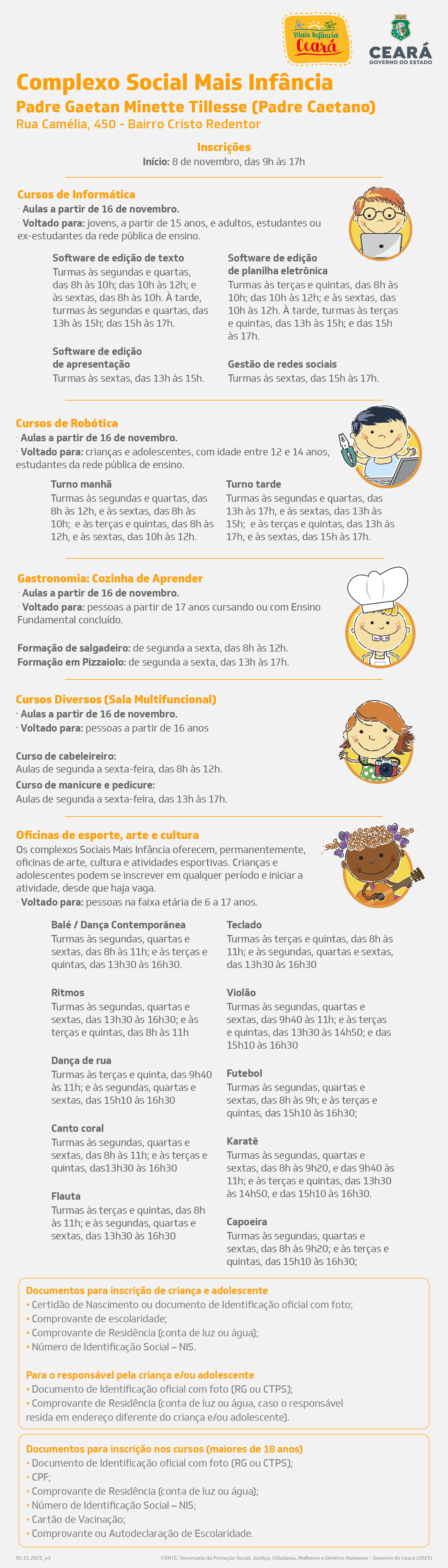 As oficinas são contínuas e os cursos ofertados em ciclos de aproximadamente três meses de duração. Podem participar das oficinas as crianças a partir de seis anos. As inscrições para as atividades começam na próxima segunda-feira (8), de forma presencial, no próprio Complexo.