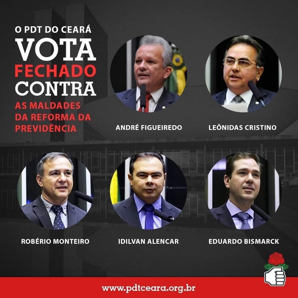A bancada pedetista cearense na Câmara dos Deputados fechou questão na votação para barrar as maldades da Reforma da Previdência. Os deputados André Figueiredo, Eduardo Bismarck, Idilvan Alencar, Leônidas Cristino e Robério Monteiro ficaram do lado do trabalhador e votaram contra essa proposta cruel votada ontem no Plenário da Câmara que aumenta o tempo para a aposentadoria. Nesta quinta-feira serão votados os destaques que podem amenizar a retirada de direitos. A bancada continua mobilizada e unida contra essa Reforma.