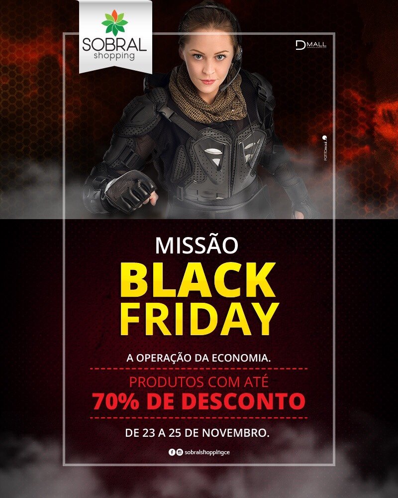 A temporada de compras mais aguardada do ano está chegando. A moda que surgiu nos Estados Unidos já virou data fixa no calendário comercial do Brasil e do Sobral Shopping, que realizará a Black Friday entre os dias de 23 e 25 de novembro. A Missão Black Friday do Sobral Shopping será da operação da economia, que vai oferecer descontos imperdíveis de até 70%. Oportunidade para quem quer adquirir aquele produto tão desejado e economizar nas compras de fim de ano para presentear toda a família.