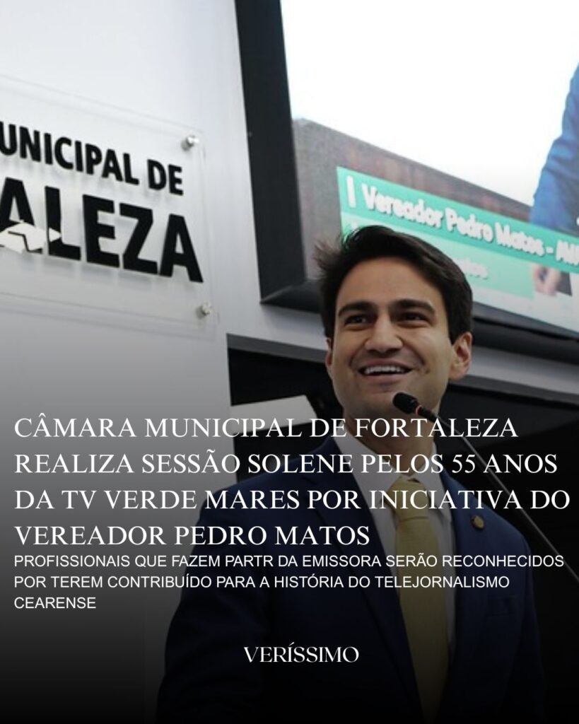 A Câmara Municipal de Fortaleza realizará, na próxima segunda-feira (23), às 18h, uma sessão solene para celebrar os 55 anos da TV Verdes Mares, emissora que desempenha um papel relevante na comunicação cearense. A iniciativa partiu do vereador Pedro Matos (Avante), autor do requerimento n.º 1168/2025, que reconhece a contribuição do veículo para a informação, cultura e desenvolvimento do jornalismo no Estado.