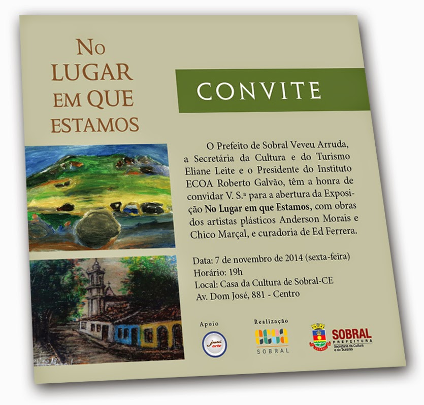 A Casa da Cultura de Sobral apresentará, a partir de sexta-feira, 7 de novembro, a exposição “No lugar em que estamos”. A abertura será às 19h com palestra do curador Ed Ferrera intitulada “Duas gerações de artistas sobralenses”. A exposição é composta por 20 “mini pinturas” de Chico Marçal e dez pinturas de Anderson Morais, que retratam paisagens da cidade.