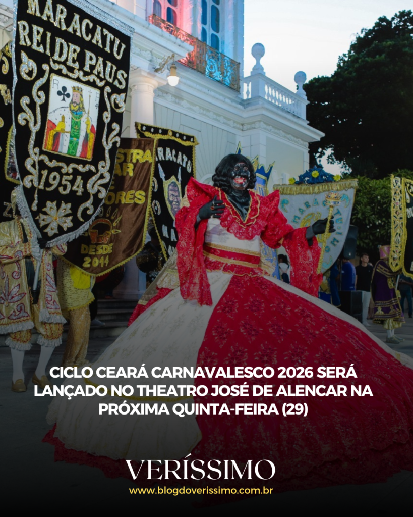 O Governo do Ceará, por meio da Secretaria da Cultura do Estado, lança no próximo dia 29 de janeiro o Ciclo Ceará Carnavalesco 2026, a partir das 17h, na calçada do Theatro José de Alencar, em Fortaleza. Com acesso gratuito, o evento chega com o tema “Entre cantigas e cortejos, mulheres ecoam a ancestralidade!”, destacando o protagonismo feminino na cultura popular e prestando homenagem a duas referências da cultura afro-brasileira no Ceará: Maria de Fátima Marcelino e Maria Lúcia Simão Pereira (in memoriam), símbolos de resistência, identidade e tradição.