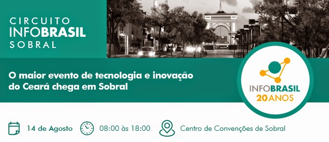 Será realizado, na quinta-feira, 14 de agosto, das 8h às 18h, no Centro de Convenções de Sobral, o Circuito InfoBrasil. O ciclo de debates e seminário é uma realização do Instituto InfoBrasil de Inovação Digital (I3D), promovido pela Secretaria de Tecnologia e Desenvolvimento Econômico de Sobral e Comissão de Ciência, Tecnologia e Educação Superior (CCTES) da Assembleia Legislativa do Estado do Ceará.