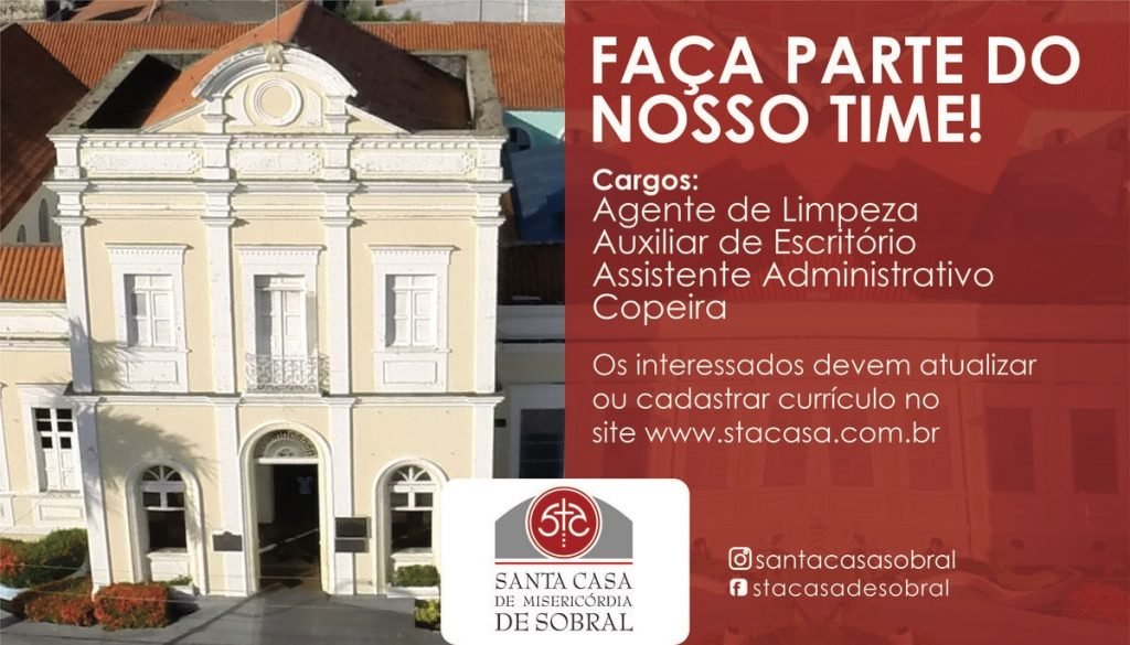 O Complexo Santa Casa de Misericórdia de Sobral está ofertando vagas de emprego nos cargos de Auxiliar de Escritório, Assistente Administrativo, Agente de Limpeza e Copeira. Os interessados devem atualizar ou cadastrar o currículo no item “Trabalhe Conosco” no site www.stacasa.com.br.