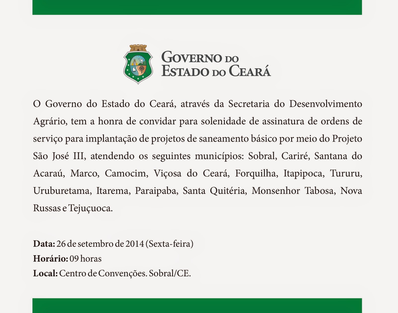 NacionalConvite adminsetembro 26, 201401 mins Tweet O Governo Cid Gomes assina, nesta sexta-feira, 26 de setembro,às 9h, no Centro de Convenções de Sobral, as Ordens de Serviço para implantação de projetos de saneamento básico do Projeto São José III em 16 municípios. Navegação de Post Previous: Professores da UVA em greveNext: Mobilização nacional pela garantia dos direitos trabalhistas Deixe uma respostaCancelar resposta Este site utiliza o Akismet para reduzir spam. Saiba como seus dados em comentários são processados.