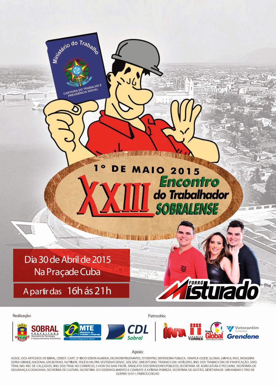 Para comemorar o Dia do Trabalhador, o Ministério do Trabalho e Emprego, a Prefeitura de Sobral e CDL promovem, na quinta-feira, 30, o XXIII Encontro do Trabalhador Sobralense. A partir das 16h, na Praça de Cuba, serão oferecidos diversos serviços de saúde, beleza e lazer, além de emissão de documentos, apresentação cultural e show com a Banda Forró Misturado.