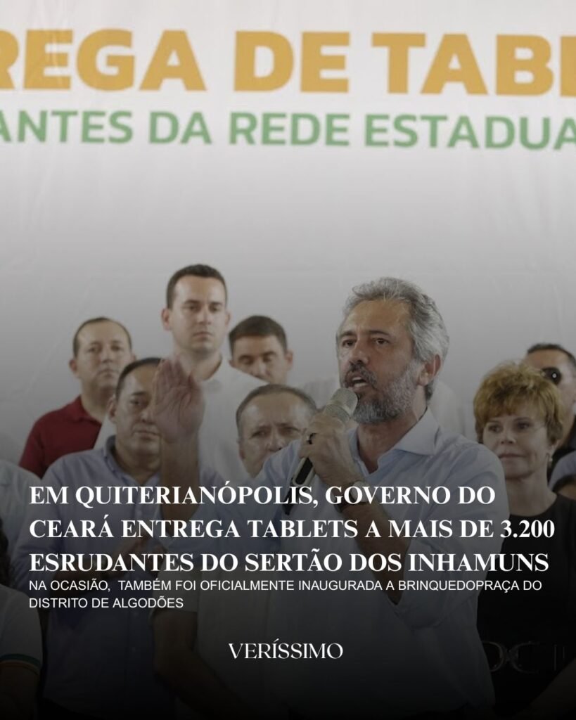 Investindo na juventude da escola pública cearense, o Governo do Ceará entregou, nesta segunda-feira (9), mais de 3,2 mil tablets para estudantes de 2ª e 3ª séries do Ensino Médio da rede estadual vinculada à Coordenadoria Regional de Desenvolvimento da Educação (Crede) 15, que abrange o Sertão dos Inhamuns. O evento, que aconteceu em Quiterianópolis, contou com a presença do governador Elmano de Freitas; da secretária da Educação, Eliana Estrela; da prefeita de Quiterianópolis, Juliana Abreu; e outras autoridades.