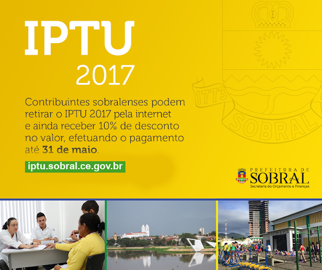 Os contribuintes residentes de Sobral já podem retirar a segunda via do Imposto Predial e Territorial Urbano (IPTU) pela internet e realizar o pagamento até o dia 31 de maio. Essa é uma iniciativa da Prefeitura de Sobral, por meio da Secretaria do Orçamento e Finanças. Disponível no endereço eletrônico iptu.sobral.ce.gov.br, os contribuintes que realizarem o pagamento dentro do prazo ganharão 10% de desconto.