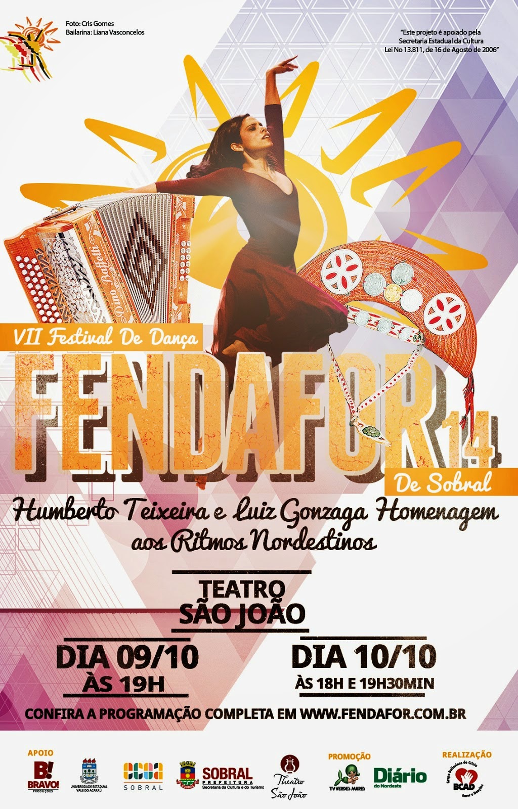 O VII Festival Internacional de Dança de Fortaleza e Itinerante do Ceará (FENDAFOR) terá apresentações em Sobral, nos dias 9 e 10 de outubro. Serão realizadas, também, 7 oficinas de dança, no Teatro São João e na Universidade Estadual Vale do Acaraú (UVA). Os interessados devem inscrever-se pelo e-mail cursos@fendafor.com.br, identificando o assunto como “Inscrição Curso Sobral”. As inscrições para os cursos variam de R$50,00 a R$70,00.
