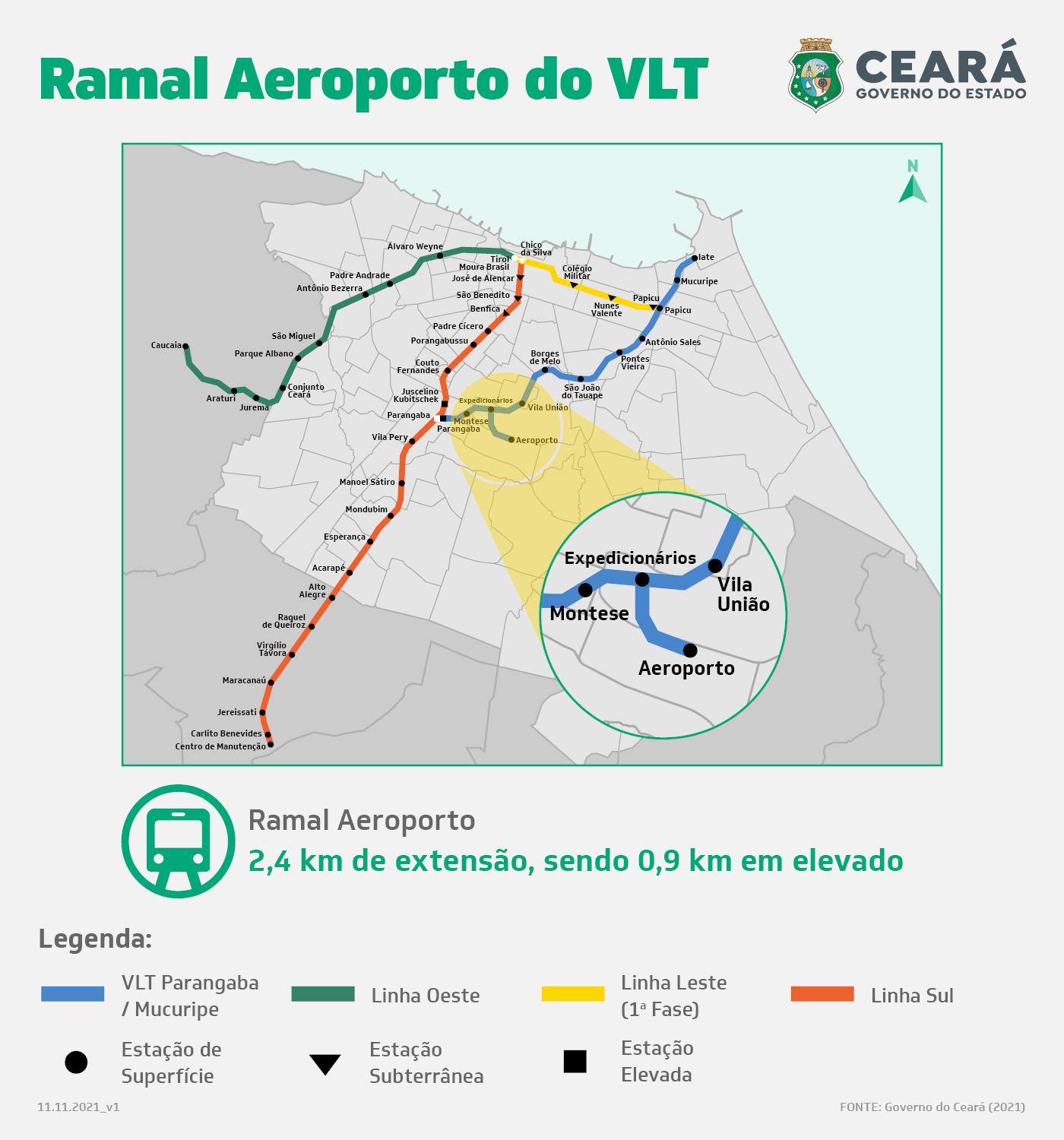 O ramal Aeroporto terá 2,4 km de extensão, sendo 0,9 km em elevado. As novas estações estarão localizadas em uma futura praça, a ser construída na Avenida dos Expedicionários, e a outra, em frente ao Aeroporto Pinto Martins. Integrada à primeira estação, também será construída uma nova, a 11ª do VLT Parangaba-Mucuripe, e ficará entre as estações Montese e Vila União, já existentes. Já a Estação Aeroporto, que será elevada, se localizará na Av. Senador Carlos Jereissati, se interligando à passarela já existente sobre a via, com acesso por meio de escadas fixas, rampas e elevador. A previsão é de conclusão em 2022. O investimento previsto é de R$ 39 milhões.