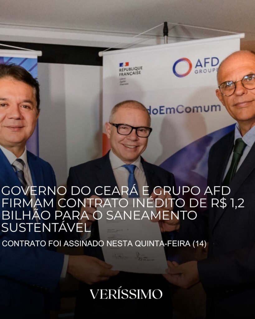 Nesta quinta-feira (14), o Governo do Ceará, por meio da Companhia de Água e Esgoto do Ceará (Cagece), assinou um contrato inovador e inédito no Brasil com o Grupo Agência Francesa de Desenvolvimento (AFD). O acordo, no valor de R$ 1,2 bilhão (200 milhões de euros), fortalecerá a trajetória sustentável da Companhia e apoiará a universalização dos serviços de água e esgoto no estado até 2033.