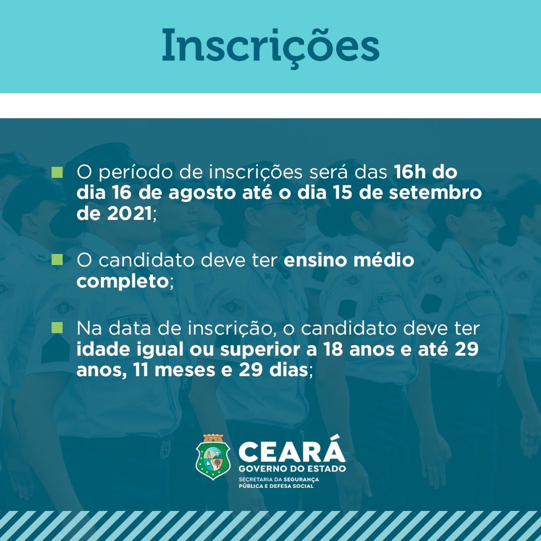 Serão 2 mil vagas destinadas a candidatos com ensino médio completo, com salários de R$ 4.192,72. O edital será publicado no Diário Oficial do Estado (DOE) desta segunda-feira, conforme divulgado pelo chefe do Executivo estadual. “Quero lembrar a importância de que esse será um reforço para a Polícia Militar, um incremento importante. O último concurso que fizemos foi para 5 mil homens, e convocamos todos. Quero dizer que assim que for homologado o resultado oficial, serão convocados e nomeados imediatamente todos os 2 mil homens a assumirem os seus cargos na Polícia Militar”, anunciou o governador Camilo Santana.