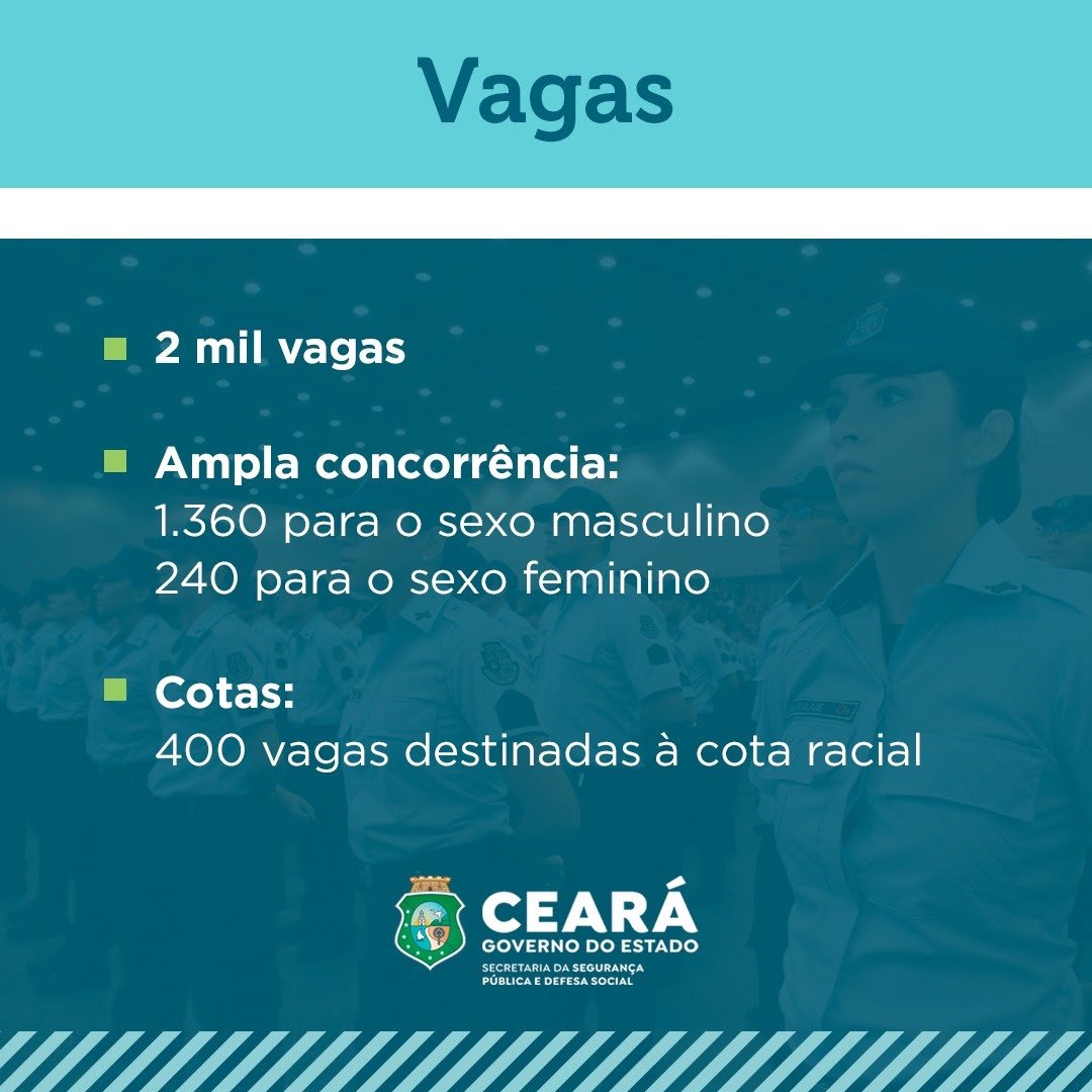 Ao todo, serão ofertadas 1.360 vagas em ampla concorrência para o sexo masculino e 240 para o sexo feminino. Respeitando à Lei Estadual nº 17.432, assinada pelo governador Camilo Santana, que garante 20% das vagas em concursos públicos estaduais para a população negra, o novo certame da PMCE dispõe de 400 vagas destinadas à cota racial, sendo 340 para candidatos do sexo masculino e 60 para o sexo feminino.