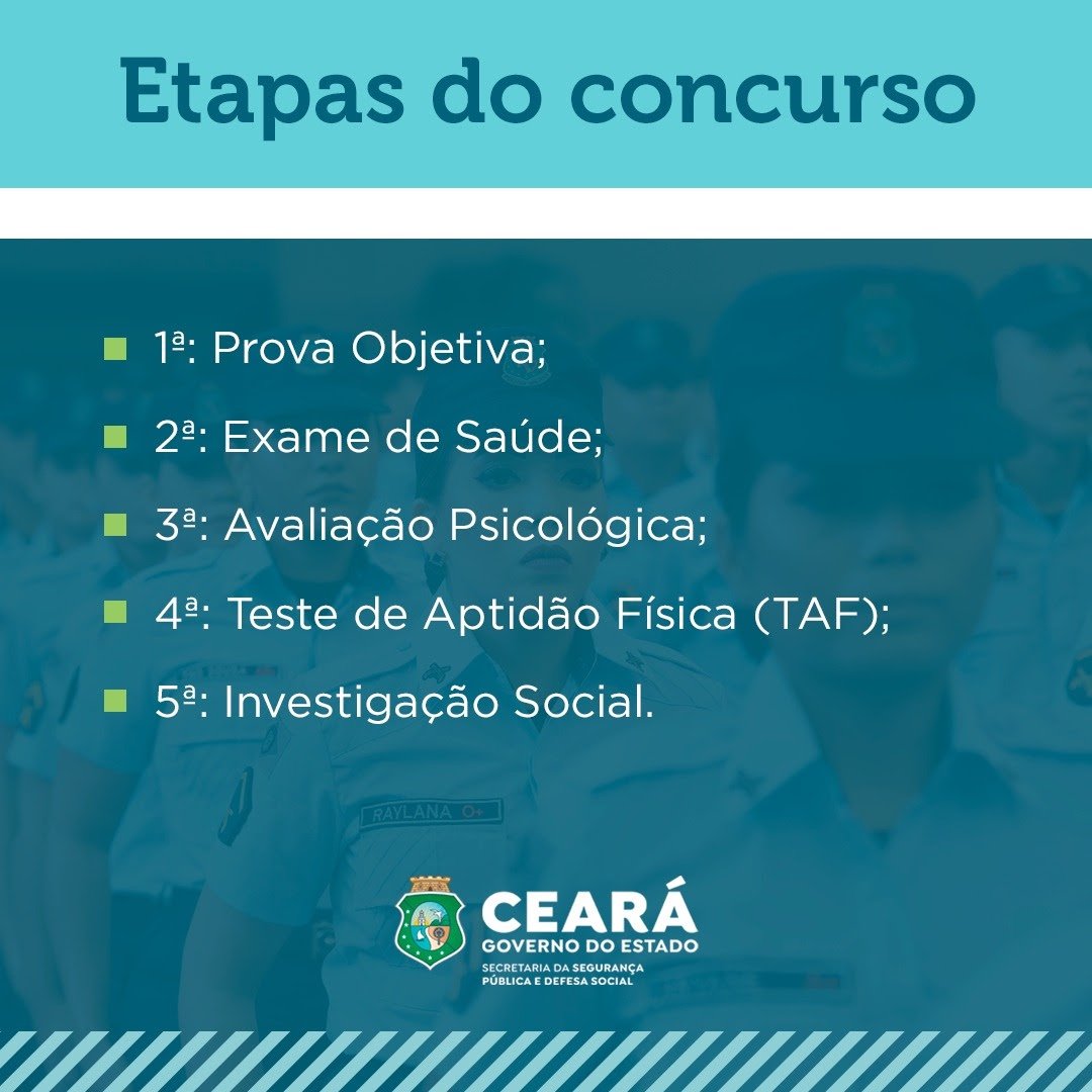 Esse é o terceiro concurso na área da Segurança Pública anunciado neste ano. Em maio, foram publicados os editais para os ingressos de novos servidores para a Perícia Forense do Estado do Ceará (Pefoce) e Polícia Civil do Estado do Ceará (PCCE), tanto para convocação imediata quanto para Cadastro de Reserva (CR).