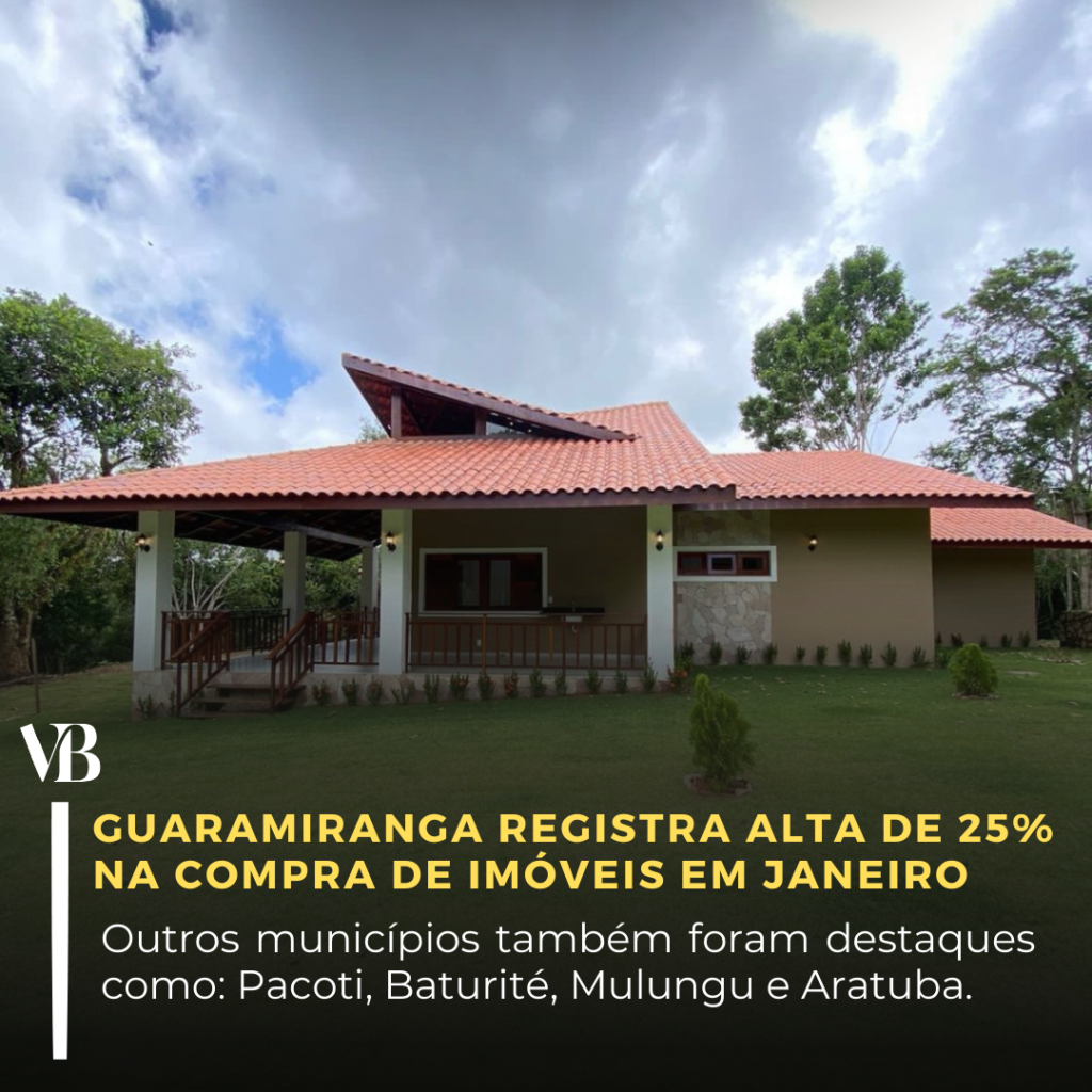 O município de Guaramiranga registrou aumento de 25% na venda de imóveis em janeiro de 2024, no comparativo com o mesmo período do ano passado. O levantamento foi realizado pela imobiliária Guaramiranga Blog.