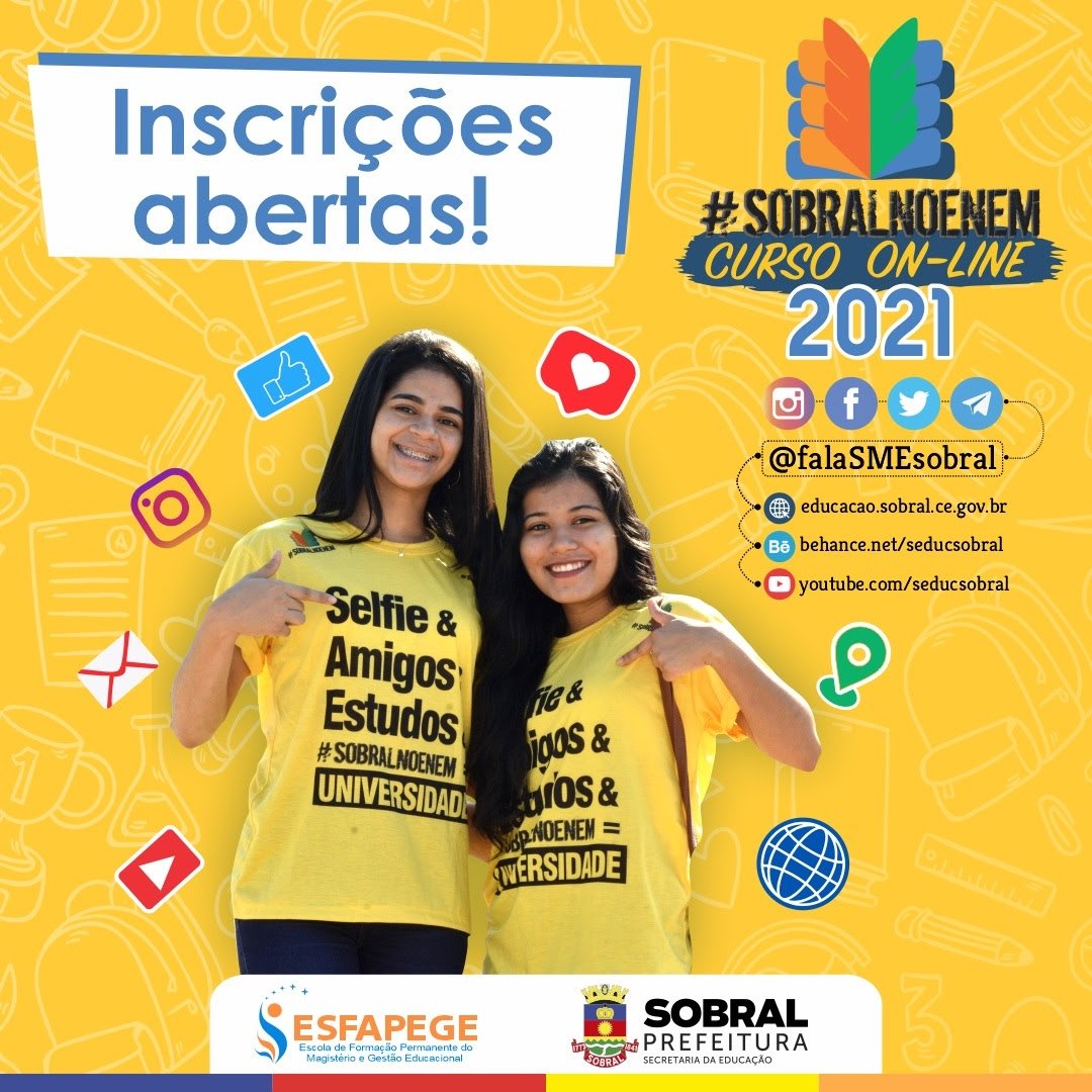 Estão abertas as inscrições para a edição de 2021 do curso preparatório #SobralnoEnem, realizado pela Prefeitura de Sobral, por meio da Secretaria da Educação de Sobral e Escola de Formação Permanente do Magistério e Gestão Educacional (Esfapege). As inscrições, que são gratuitas, seguem até o dia 4 de agosto, exclusivamente pela internet.