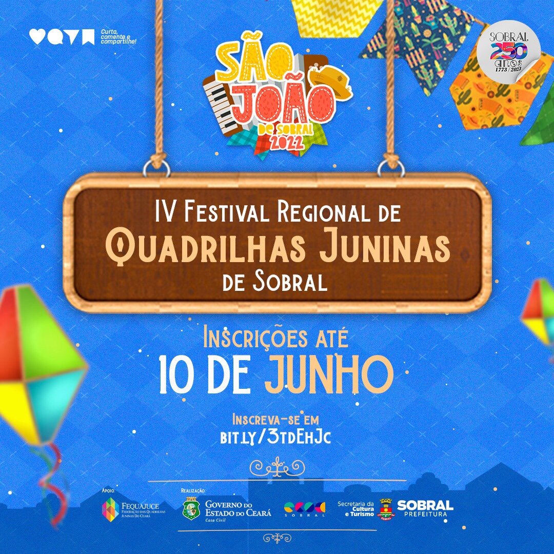 A Prefeitura de Sobral, por meio da Secretaria da Cultura e Turismo (Secult), filiada à Federação das Quadrilhas Juninas do Ceará (FEQUAJUCE), divulga a chamada pública para o IV Festival Regional de Quadrilhas Juninas, que será realizado, nos dias 24 e 25 de junho, na Praça São João.