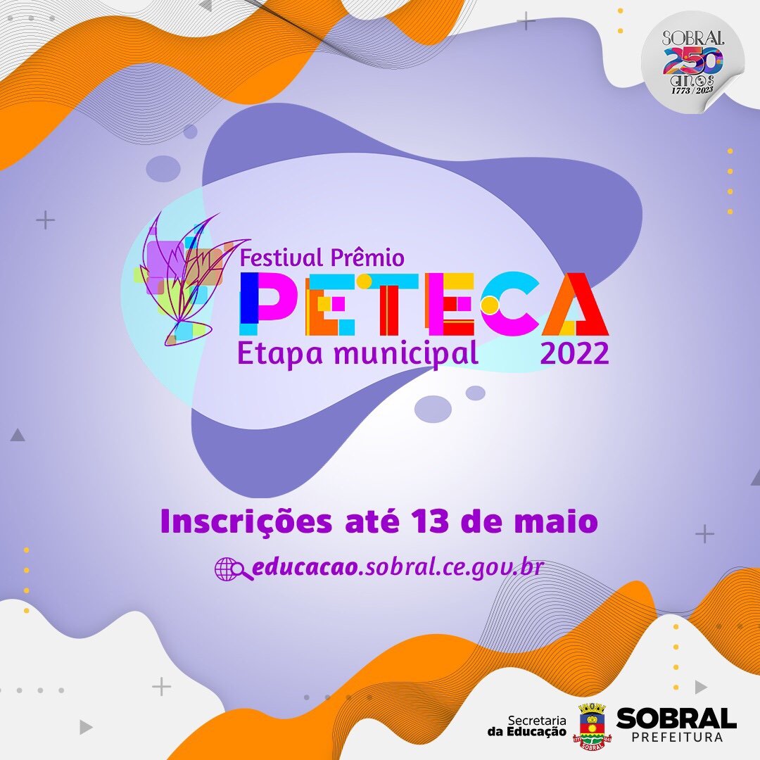 Estão abertas as inscrições para o Festival Prêmio Peteca 2022, promovido pela Secretaria da Educação de Sobral, por meio da Brinquedoteca Municipal. As escolas municipais terão até o dia 13 de maio para inscrever os trabalhos dos estudantes nas modalidades: conto, poesia, desenho e música.