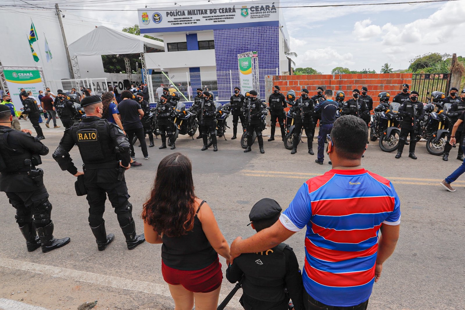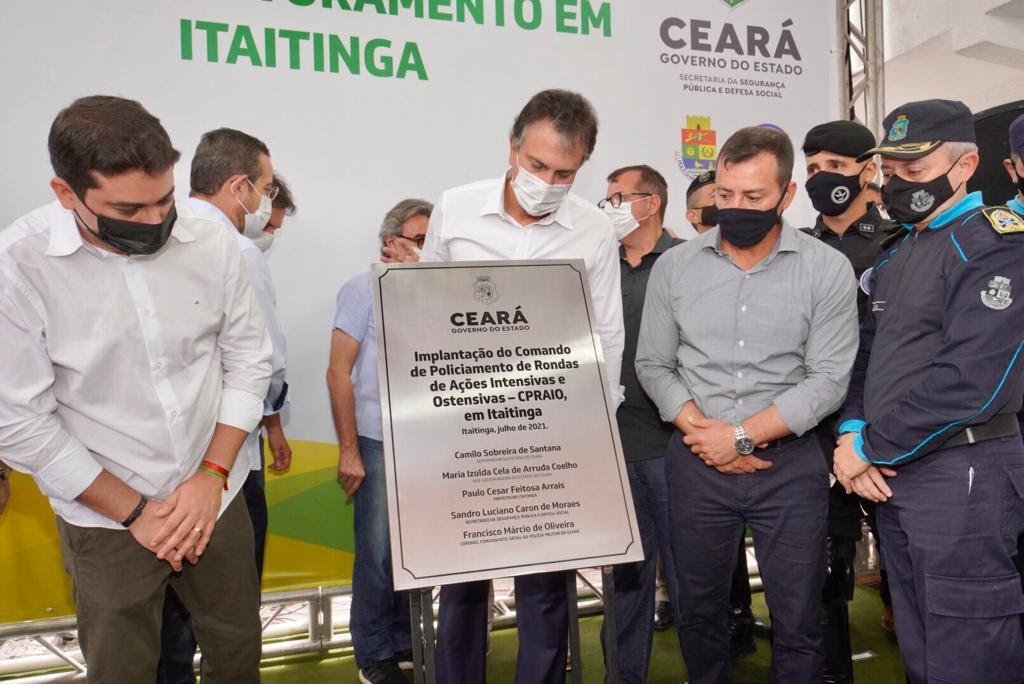 Reforço na Segurança Pública do Ceará. O governador Camilo Santana entregou, na manhã desta quarta-feira (28), a 47ª base do Comando de Policiamento de Rondas e Ações Intensivas e Ostensivas (CPRaio) da Polícia Militar (PMCE) e uma central de videomonitoramento em Itaitinga, na Região Metropolitana de Fortaleza (RMF). Com transmissão via redes sociais, a solenidade teve a presença do secretário da Segurança Pública e Defesa Social (SSPDS), Sandro Caron, do comandante geral da PM, coronel Márcio de Oliveira, do comandante do CPRaio, tenente-coronel Kilderlan Nascimento, além de outras autoridades.