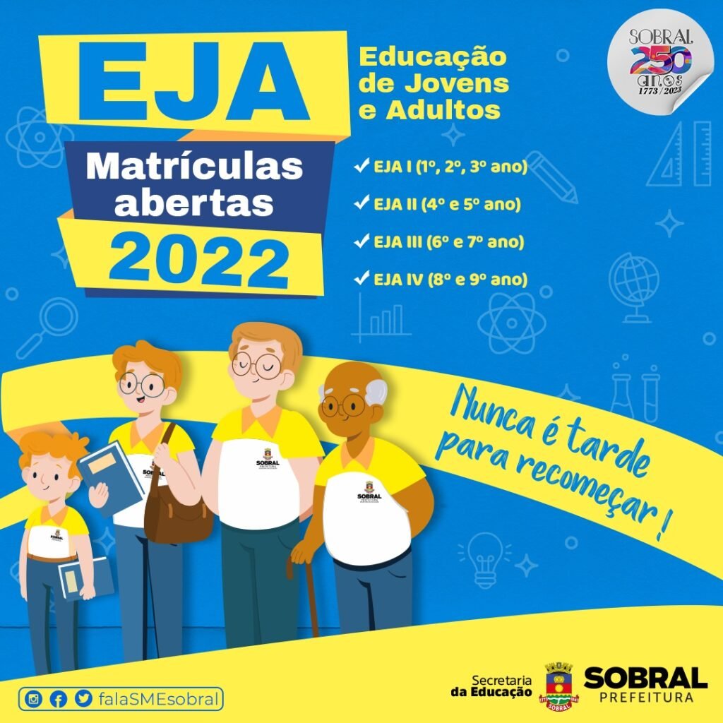Estão abertas as matrículas para os interessados em concluir o Ensino Fundamental (1º ao 9º ano) na Educação de Jovens e Adultos (EJA) em Sobral. A modalidade é ofertada em 27 escolas da rede pública municipal de ensino. As aulas ocorrem no período da noite, de segunda a sexta-feira.