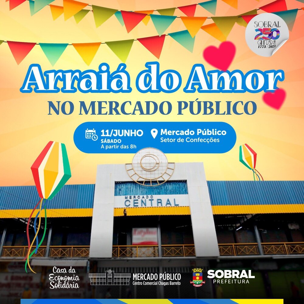 O Mercado Público de Sobral promoverá, dia 11 de junho (sábado), às 8h, o Arraiá do Amor no setor de confecções. O evento vai combinar as temáticas do Dia dos Namorados e os festejos de São João. Entre as atrações confirmadas, está a sanfoneira Rosinha do Acordeon, realizada com o apoio da Secretaria da Cultura e Turismo (Secult).