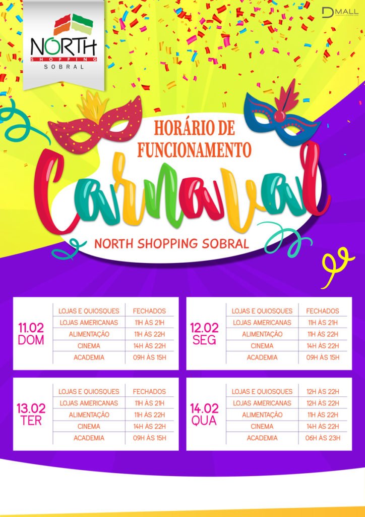 O North Shopping Sobral vai operar em horário diferenciado durante o carnaval. No sábado, dia 10, as lojas, quiosques e a Praça de Alimentação do Shopping vão funcionar normalmente das 10h às 22h, o Multicine Cinemas das 14h às 22h e a academia Smart Fit das 8h às 14h.