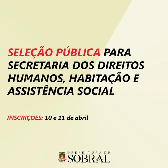 A Prefeitura de Sobral recebe inscrições, entre os dias 10 e 11 de abril, para seleção pública e contratação temporária para 206 vagas para a Secretaria dos Direitos Humanos, Habitação e Assistência Social. O edital foi publicado nesta terça-feira (04/04), no Diário Oficial do Município, e as vagas são destinadas a profissionais de nível fundamental, médio e superior.