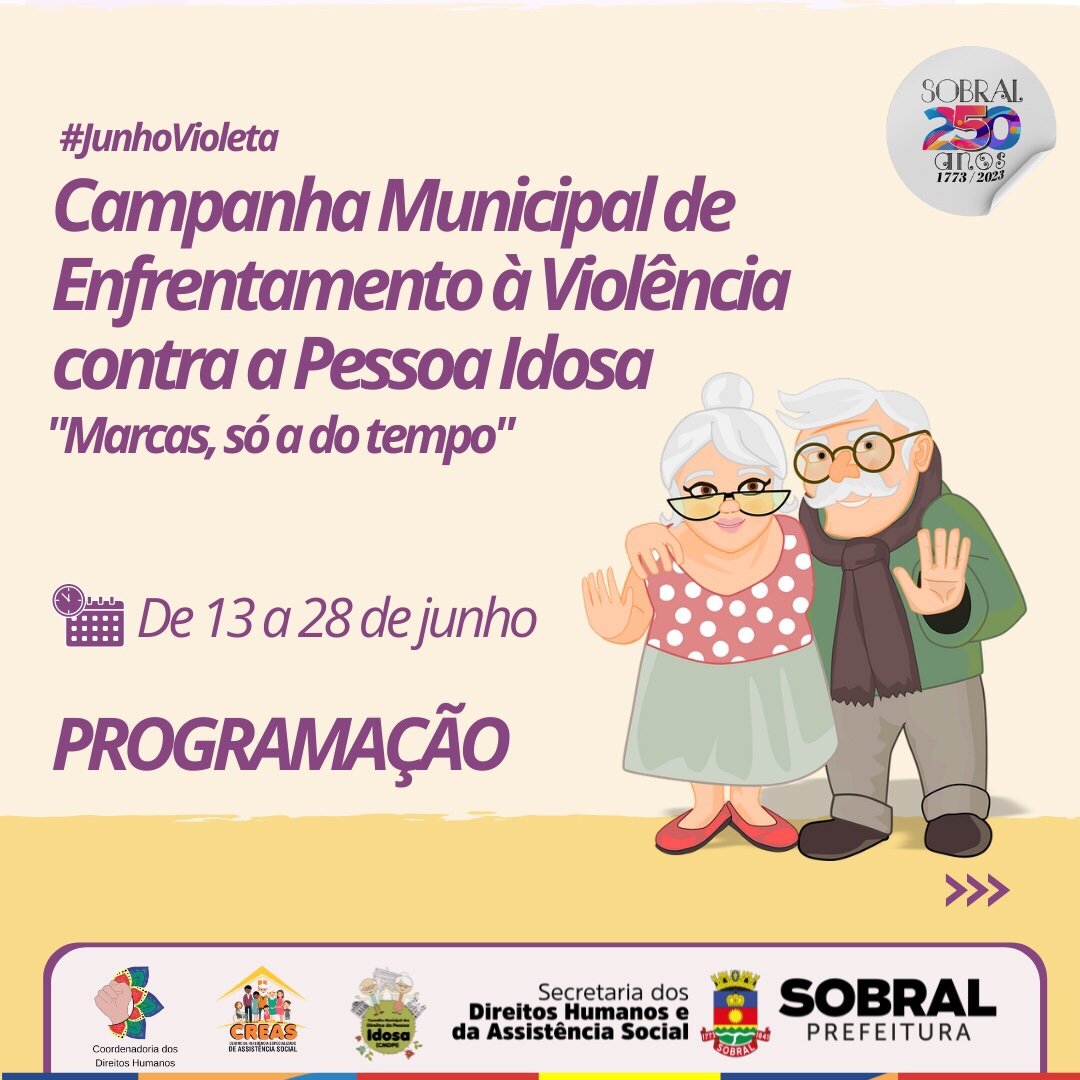A partir de 13 de junho, a Prefeitura de Sobral inicia uma programação voltada para a conscientização e o enfrentamento à violência contra a pessoa idosa. Com o tema “Marcas, só a do tempo”, as ações terão como foco idosos, suas famílias e cuidadores que atuam em instituições de cuidado.