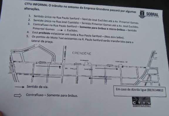A Prefeitura Municipal de Sobral anuncia mudanças no trânsito. Por meio da Secretaria da Segurança e Cidadania, iniciou campanha educativa nos bairros Alto da Brasília, Parque Silvana I, Alto da Expectativa e Residencial Meruoca para informar sobre as mudanças nas vias de acesso à Grendene. Além desta campanha, os agentes da CTTU realizam atividades tais como orientar motoristas sobre as alterações no fluxo das vias, principalmente no horário de pico.
