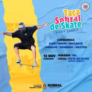 A Prefeitura de Sobral, por meio da Secretaria da Juventude, Esporte e Lazer (Secjel), realizará, no dia 12 de novembro (sábado), a partir das 16h, a Taça Sobral de Skate 2022. A competição acontecerá na pista de skate localizada no bairro Sinhá Saboia e contará com as categorias kids, mirim, iniciante, amador, feminino e master.