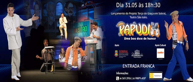 Nesta terça-feira (31), às 18h30, o Theatro São João será palco do relançamento do Projeto ‘Terças de Graça em Sobral’. Na ocasião, será apresentado o espetáculo gratuito ‘Uma boa dose de humor’. O projeto, que é coordenado pelo humorista e produtor cultural Bené Barbosa, conta com apoio cultural da Coelce e da Prefeitura de Sobral, através da Secretaria da Cultura e do Turismo.
