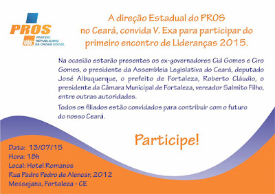 O PROS do Ceará vai promover o Primeiro Encontro Político do ano de 2015, ainda neste mês de julho. Com as presenças dos ex-governador Cid e Ciro Gomes, o Presidente da Assembleia Legislativa, deputado Zezinho Albuquerque; o prefeito de Fortaleza, Roberto Cláudio; o Presidente da Câmara de Fortaleza, Salmito Filho, ato político acontece, com todos os filiados, no próximo dia 13 de julho, às 18Hs, no Hotel Romanos.