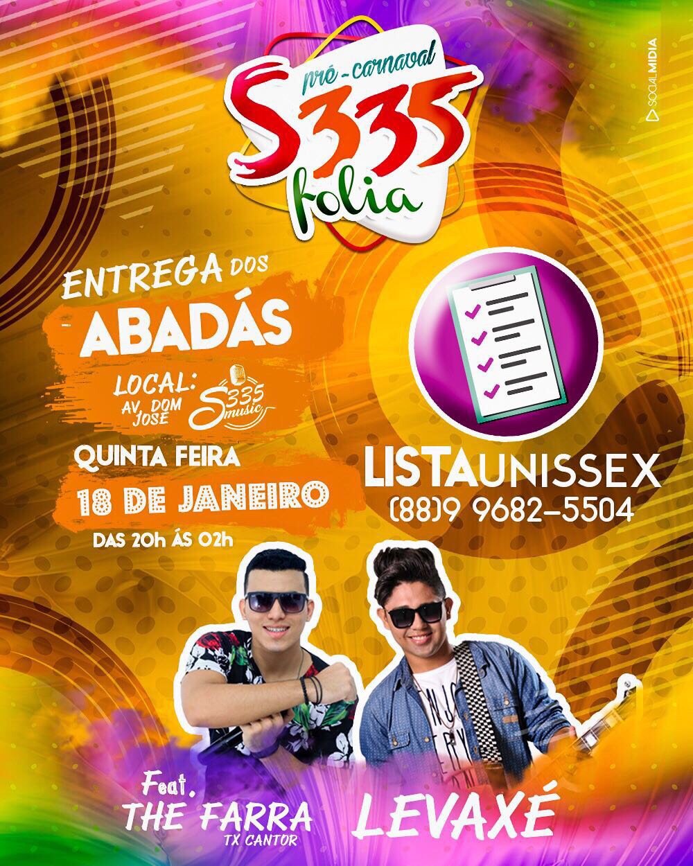 Nesta Quinta-feira 18 de Janeiro, acontece a entrega de abadás do #S335folia2018 com @bandalevaxe e festa da @thefarraoficial, mande seu nome para #ListaVipUnissex do @s335Folia e vamos curtir juntos!!!