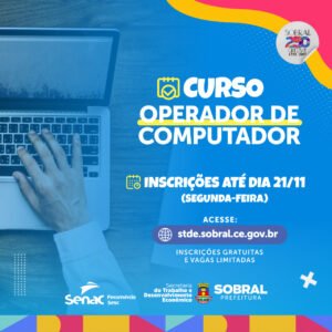 Estão abertas, até segunda-feira (21/11), as inscrições gratuitas do curso de Operador de Computador para pessoas a partir de 16 anos de idade. A capacitação faz parte do Programa Senac de Gratuidade e é fruto da parceria entre a Secretaria do Trabalho e Desenvolvimento Econômico (STDE) e o Serviço Nacional de Aprendizagem Comercial (Senac).