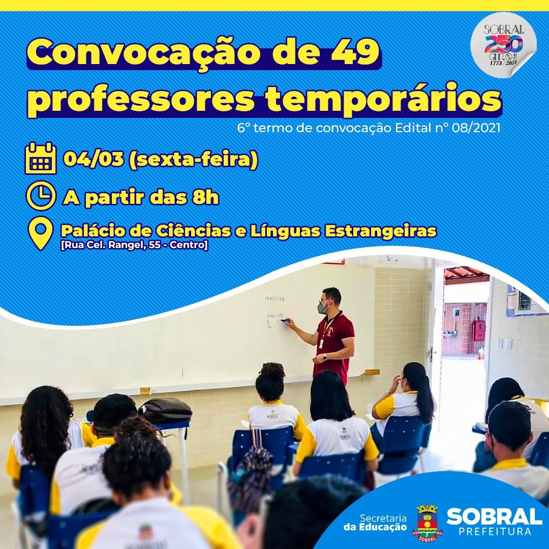 A Secretaria da Educação de Sobral está convocando mais 49 aprovados na seleção pública de professores temporários (Edital nº 08/2021). A lotação será realizada na sexta-feira (04/03), a partir das 8h, no Palácio de Ciências e Línguas Estrangeiras, localizado na Rua Cel. Rangel, nº 55 , Centro.