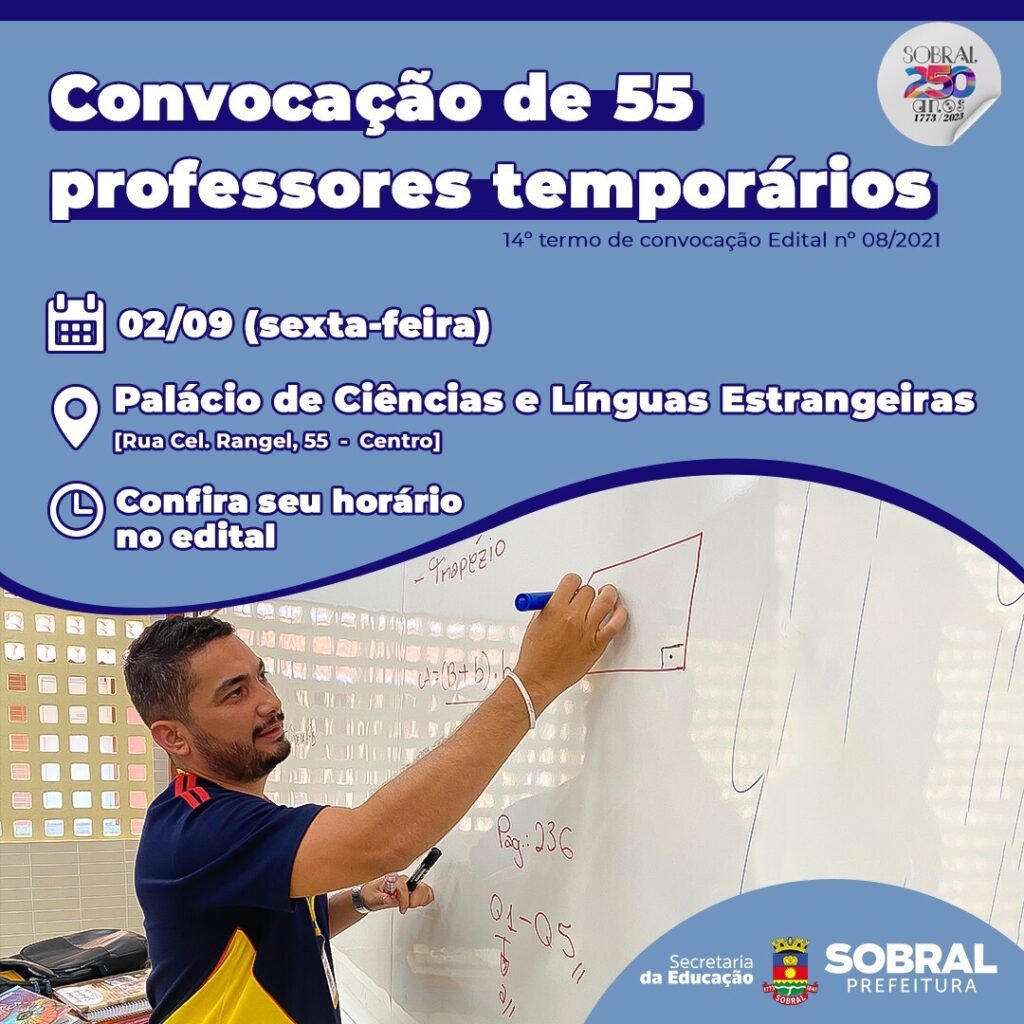 A Secretaria da Educação de Sobral está convocando mais 55 aprovados na seleção pública de professores temporários (edital nº 08/2021). A lotação será realizada na sexta-feira (02/09), nos períodos da manhã e tarde, no Palácio de Ciências e Línguas Estrangeiras, localizado à Rua Cel. Rangel, 55, no Centro, conforme o termo de convocação. É necessário que o candidato confira o seu horário no edital de convocação.