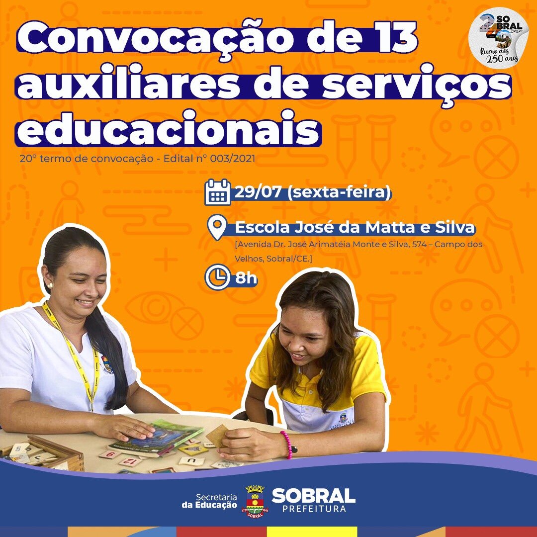 A Secretaria da Educação de Sobral está convocando mais 13 aprovados na seleção pública para o cargo de auxiliar de serviços educacionais (edital nº 03/2021). A lotação será realizada, na sexta-feira (29/07), às 8h, na Escola José da Matta e Silva, localizada na Avenida Doutor José Arimatéia Monte e Silva, 574, no bairro Campo dos Velhos, conforme o termo de convocação.