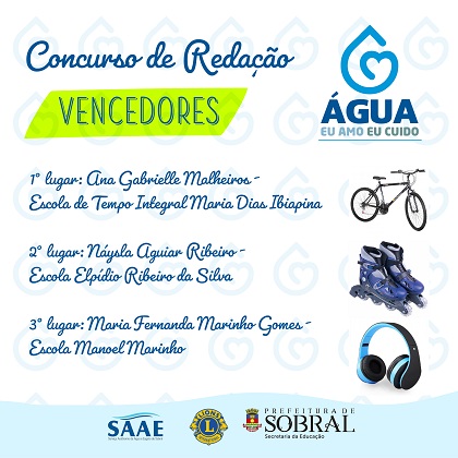 Três estudantes das escolas municipais de Sobral serão premiados no concurso de redação “Água: Eu amo, eu cuido”, promovido pelo Lions Clube de Sobral e Serviço Autônomo de Água e Esgoto (SAAE), em parceria com a Secretaria da Educação de Sobral. O evento será realizado no dia 4 de abril, às 19h, no Theatro São João.