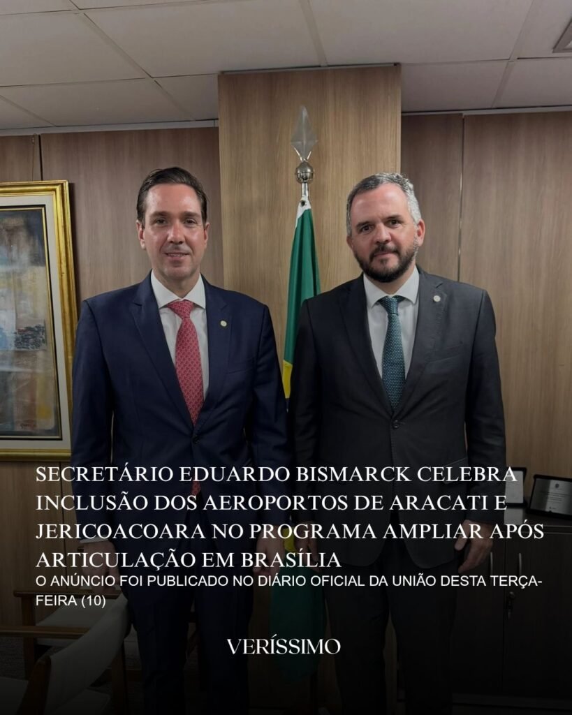 “Somos gratos ao secretário Tomé Franca, que acolheu com sensibilidade nosso pleito e acelerou os estudos técnicos, e ao ministro Silvio Costa Filho, que prontamente viabilizou a inclusão dos nossos aeroportos no edital. Agora, nossa expectativa é que as concessionárias possam assumir a operação e impulsionar o desenvolvimento desses importantes equipamentos, com mais voos, conforto e conectividade para o povo cearense e para quem nos visita”, concluiu Eduardo Bismarck.