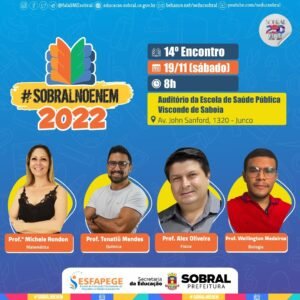 A Secretaria da Educação de Sobral realiza, neste sábado (19/11), o 14º encontro do #SobralnoEnem 2022. A partir das 8h, o curso será realizado no auditório da Escola de Saúde Pública Visconde de Saboia, localizado na Avenida John Sanford, 1320, bairro Junco.