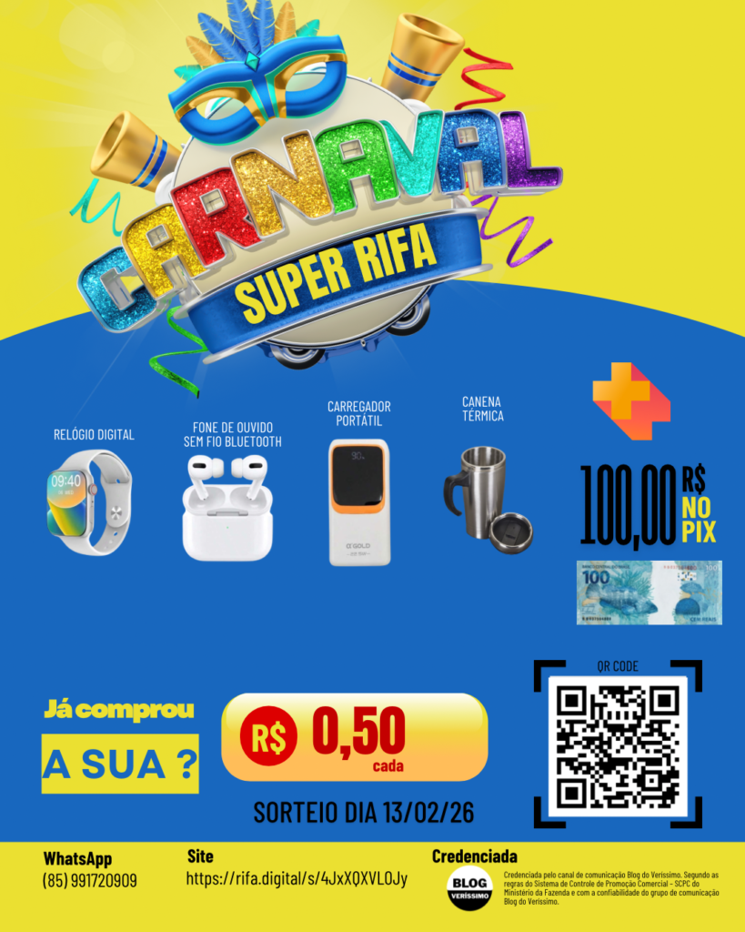 São cinco prêmios por apenas cinquenta centavos, pra você já curtir o Carnaval preparado e com sorte ao seu lado. Acesse a bio do Instagram @blogdoverissimo, entre no site blogdoverissimo.com.br e clique na página Super Rifa Carnaval, ou participe pelo WhatsApp (85) 99172-0909.