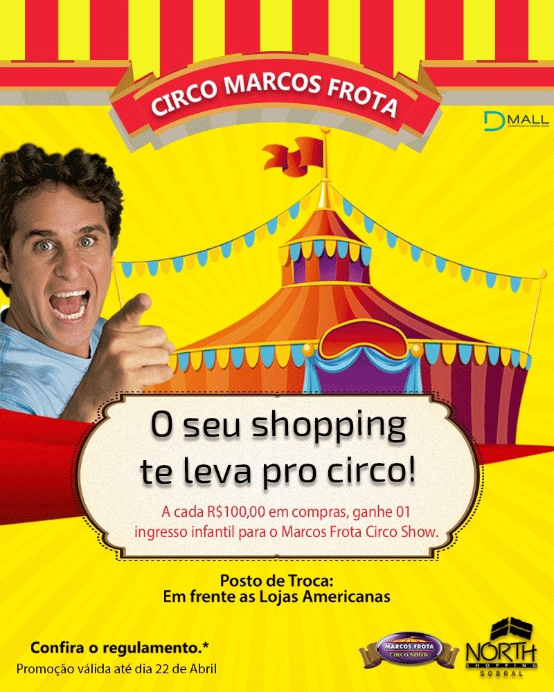 Reta final da promoção do North Shopping Sobral e Marcos Frota Circo Show. Os clientes que realizarem compras a partir de R$100,00 nas lojas do Shopping ganharão um ingresso infantil para o Marcos Frota Circo Show.