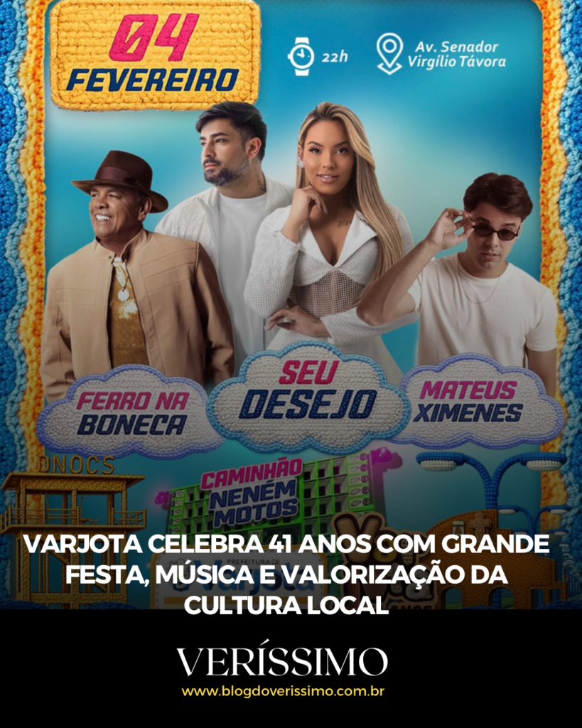A programação acontece na Avenida Senador Virgílio Távora, a partir das 22h, prometendo movimentar a cidade e atrair moradores e visitantes da região. O evento integra o calendário oficial do município e reforça o compromisso da Prefeitura de Varjota com a valorização da cultura, do lazer e da identidade local, celebrando um novo tempo rumo a um futuro que transforma.