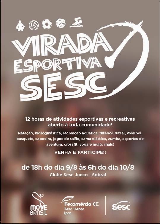 No próximo final de semana haverá virada esportiva em Sobral. As 12 horas de lazer e esportes acontece na unidade do Sesc Junco. Os sobralenses poderão participar de diversas atividades. A programação gratuita começa às 18h do sábado e segue até as 06h do domingo. Uma maratona que deve oferecer opções de esporte e lazer para toda a comunidade.