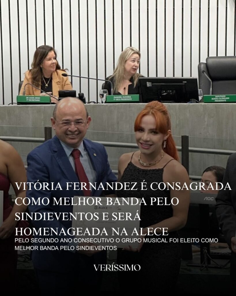 Com talento reconhecido e uma trajetória marcada por sofisticação e presença de palco, a banda Vitória Fernandez mais uma vez reafirma seu protagonismo no cenário de eventos e celebrações do Ceará. Pelo segundo ano consecutivo, o grupo musical foi eleito como Melhor Banda pelo Sindieventos, entidade que representa os profissionais e empresas do setor de feiras e eventos no Estado.